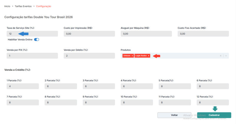Coloque os tipos de ingresso e cadastre as taxas (Atualmente a taxa do site padrão é 12%) e clique em cadastrar.