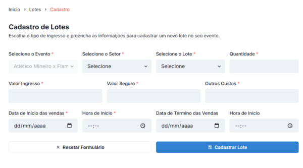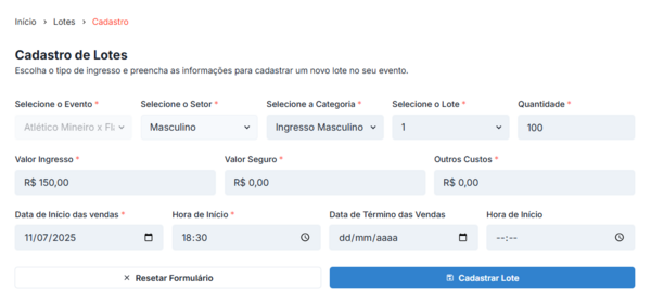 Após preencher todos dados clique em “Cadastrar Lote”: