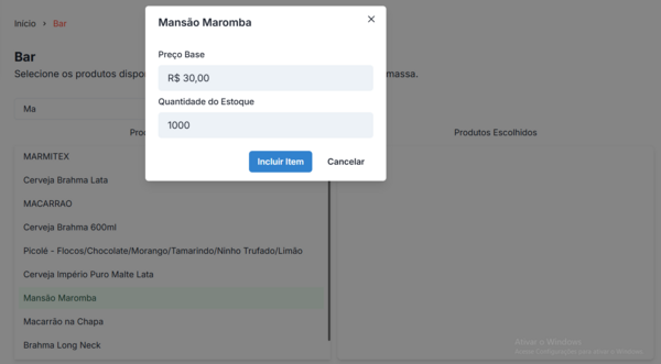 Selecione o produto coloque o “Preço Base” e “Quantidade do Estoque”, clique em “Incluir Item” e salve: