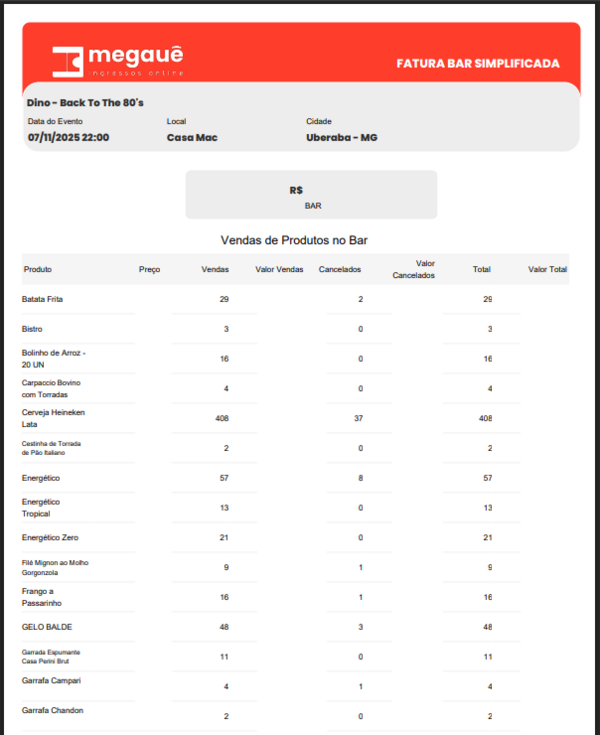 Nesse relatório contém logo na primeira página o valor líquido do bar no evento. Mais abaixo tem cada item do cardápio mostrando Preço, Quantidades de Vendas, Valor das Vendas (Preço x Quantidade de vendas), Quantidade de Cancelados, Valor Cancelados (Preço x Quantidade de Cancelados), Total (Quantidade de Venda - Quantidade de Cancelados) e Valor Total (Valor das Vendas - Valor Cancelados).