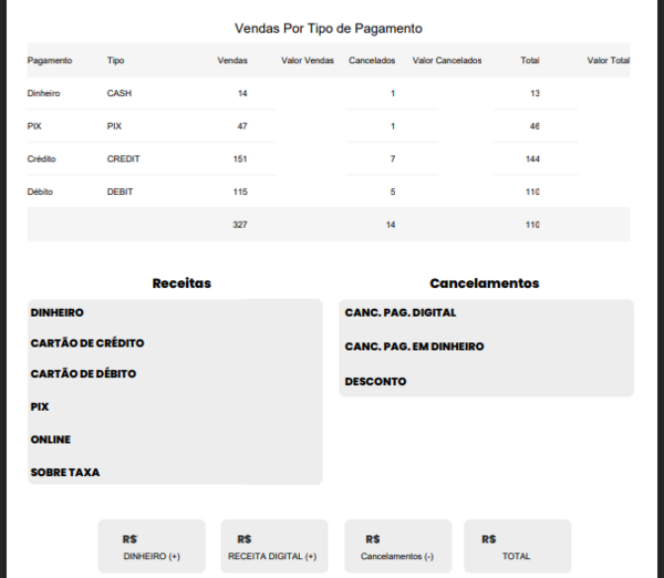 Na última página do PDF tem as Receitas e Cancelamentos, tudo que vendeu em Dinheiro, Pix, Cartão de Débito e Crédito.