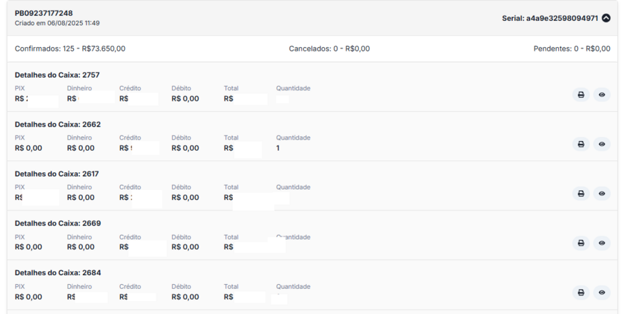 Escolher a máquina que deseja, e terá o fechamento de cada caixa criado na maquina (esse relatorio não altera depois do caixa fechado):